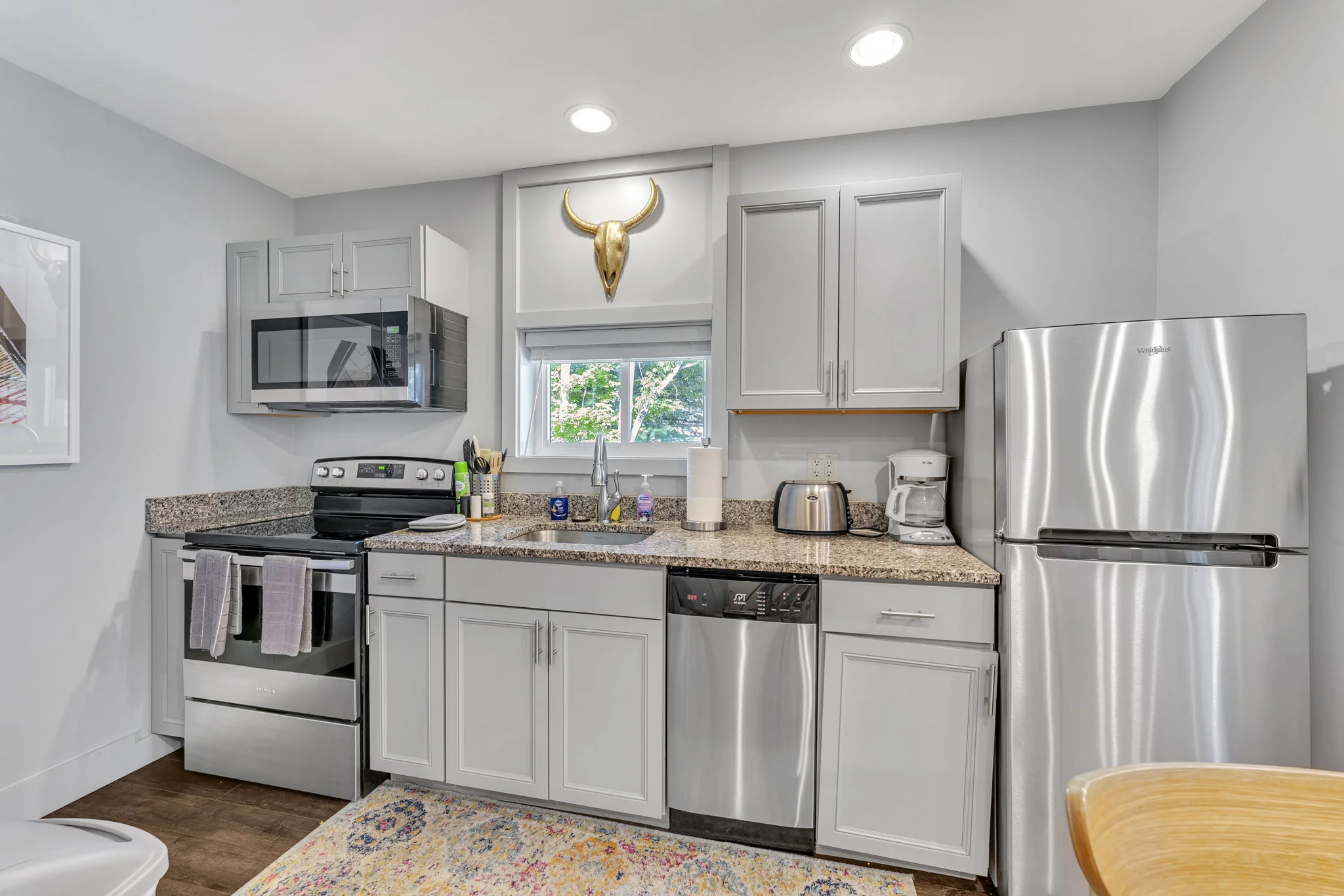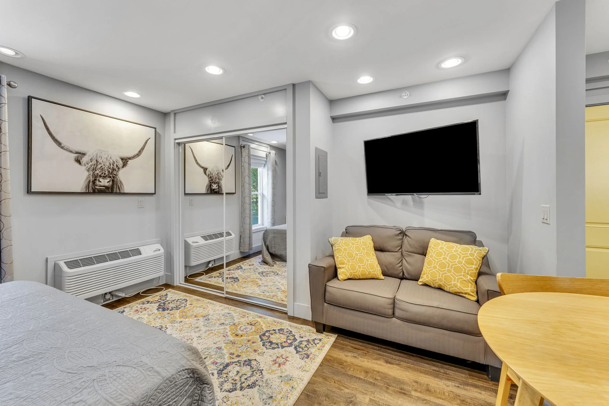 Creamery Apartment 11 is a fully furnished, second floor studio apartment with king bed. Rental rate from August 17 2024 to May 15, 2025 is $1400/month including utilities. Apartment 11 Amenities: Fully equipped kitchen with dishwasher Full bath with 60" walk-in shower King size bed Non-smoking rooms Bed and bath linens Hair dryer Flat screen TV High-speed wireless internet — excellent signal ROKU streaming devices on all TVs Air conditioning Free off-street parking On-site laundry facilities (coin operated) Iron/Ironing Board